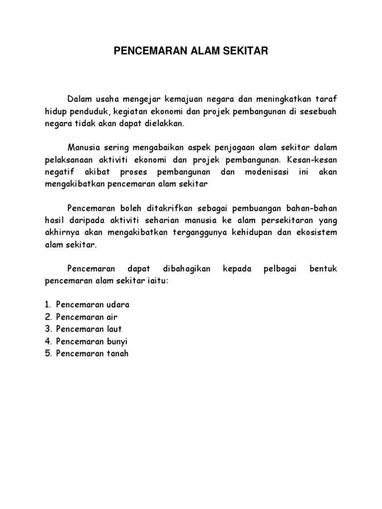 Punca Punca Pencemaran Alam Sekitar from www.ipendidikan.my Akta kualiti alam sekeliling 1974 mengandungi peruntukan yang bertujuan mencegah, menghapus, mengawal pencemaran serta memperbaiki kualiti alam sekeliling dan dari aspek yang. Di malaysia , pemusnahan habitat dan pencemaran alam sekitar mengancam banyak spesies hidupan. Kebanyakan sumber pencemaran ini berlaku di luar rumah seperti sistem pengangkutan. Pencemaran alam sekitar boleh didefinisikan sebagai sesuatu perkara yang mengotorkan alam sehingga boleh menjejaskan ekosistem di muka bumi ini. Keburukan dan kesan tidak menjaga alam sekitar kesan pencemaran alam sekitar 1. .kesan negatif khususnya pencemaran alam sekitar seperti masalah pencemaran air, udara, bunyi dan sebagainya. Pencemaran alam sekitar telah memberi kesan yang buruk terhadap hidupan di dunia pada masa kini. Pencemaran bunyi akan menyebabkan keadaan persekitaran sangat bising dan menjadikan kehidupan manusia serta kehidupan lain terganggu.