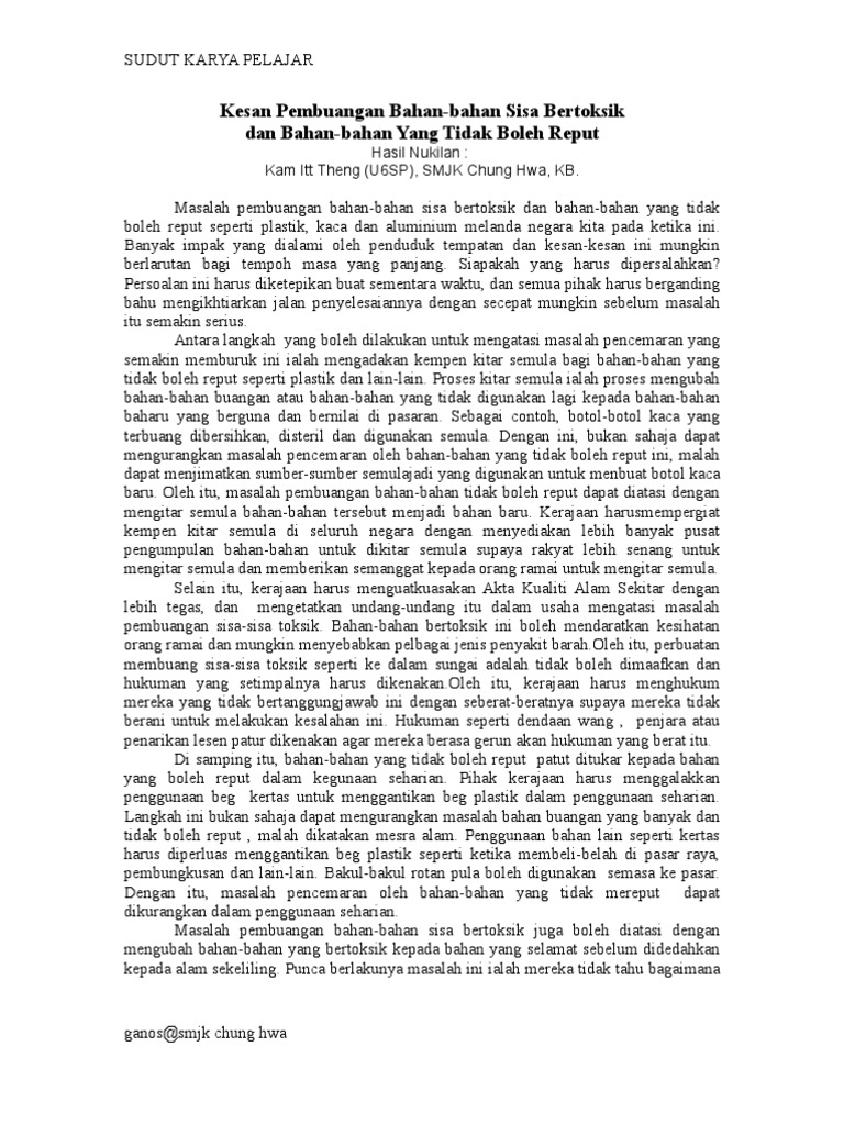 Nuraneesa binti md ismail kelas: Buangan sisa domestik sangatlah berbahaya baik bagi lingkungan ataupun pada manusia. Langkah mengurangkan kesan pembuangan sisa domestik di malaysia. Kesan pembuangan sisa domestik di kawasan perumahan ialah wabak penyakit,pencemaran. Langkah demi langkah menyediakan kerja lapangan geografi tingkatan 1. Pembuangan sisa makanan kian meningkat, dan industri makanan akan menghadapi masalah perniagaan jikalau oleh itu, mengurangkan pembaziran makanan perlu dijadikan initiatif oleh industri makanan dalam seluruh. Pepejal majoriti sisa domestik berpunca daripada aktiviti harian manusia dan selebihnya dari tindak balas semulajadi alam sekitar contoh sisa. Langkah mengurangkan kesan pembuangan sisa domestik. Kesan pembuangan sisa domestik di malaysia. Amalan 3r mampu mengurangkan kesan pembuangan sisa domestik. Sisa domestik di malaysia sisa yang terhasil dari kawasan perumahan. Terdapat 4 kesan pembuangan sisa domestik iaitu pencemaran, munculnya wabak penyakit, peningkatan dalam kos penyelenggaraan dan banjir kilat. Membincangkan kesan pembuangan sisa domestik di malaysia.