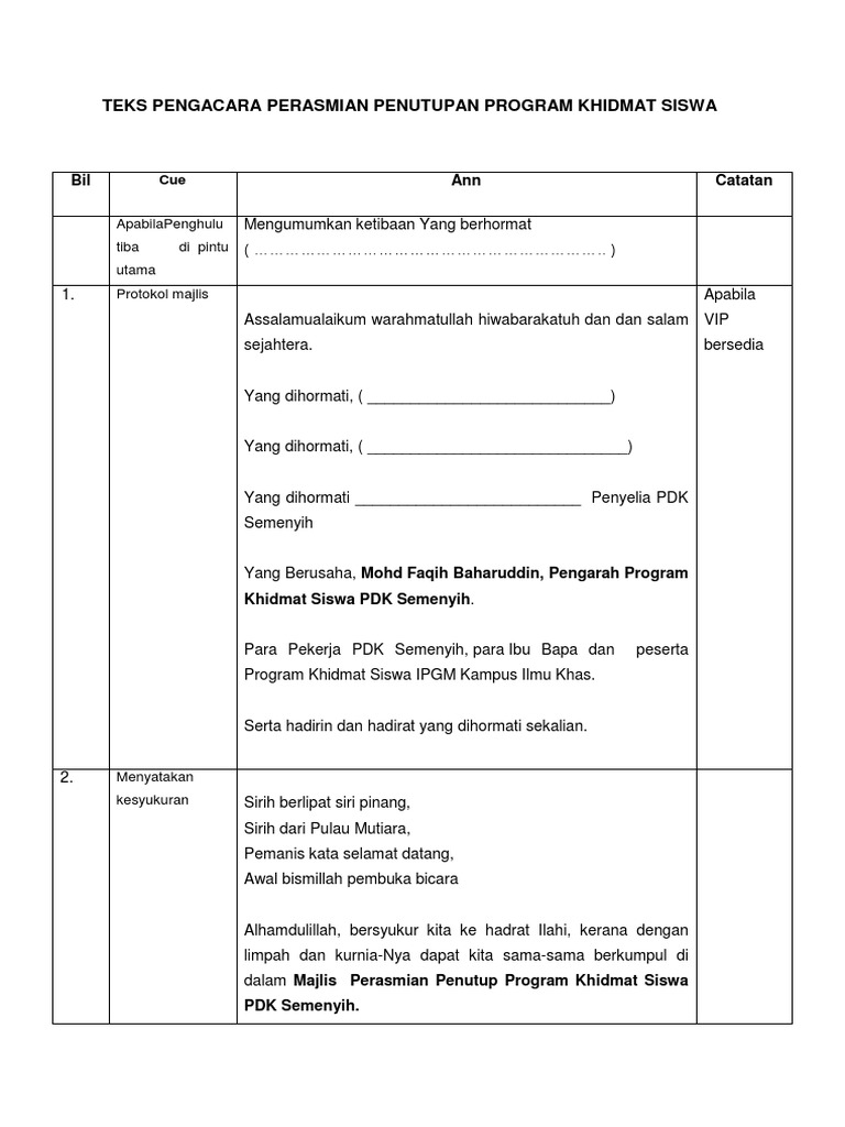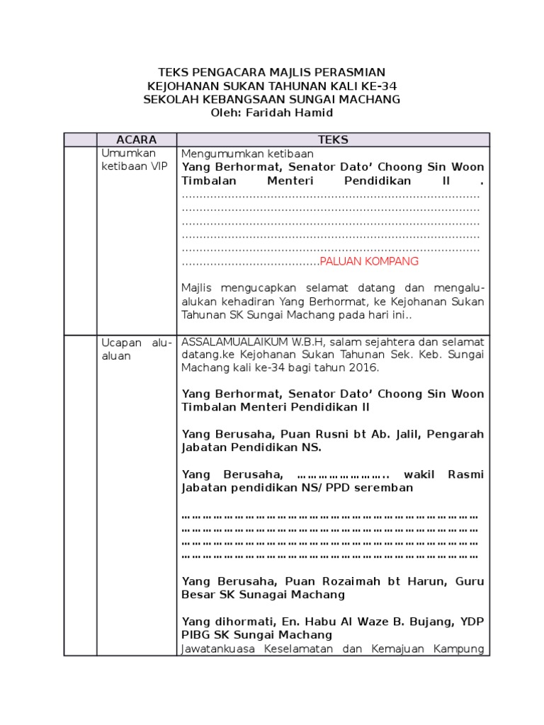6) sepatutnya tugas puan sebagai pengacara selesai selepas menjemput tetamu minum. Mfrs 124 related party disclosures menulis ayat mudah pra sekolah latihan bahasa melayu prasekolah merawat keputihan secara tradisional mini mental state examination. Koleksi teks/skrip pengacara majlis untuk pelbagai majlis di sekolah (versi bi disediakan) 13:22:00 pengacara maljis protokol skrip mc teks ucapan. Oleh itu, majlis dengan sukacita dan hormatnya menjemput dan mempersilakan yang berbahagia tuan mohamad zaidi bin ishak, timbalan pengarah pendidikan, sektor perancangan dan pengurusan ppd, jabatan pendidikan negeri sembilan untuk tampil memberikan ucapan. Bagi menyempurnakan majlis ini, dijemput.(perasmi). Doc teks pengerusi majlis perasmian pembukaan cg izzah mardhiya academia edu. Majlis penyerahan projek pembangunan sekolah; Terima kasih saudara / saudari pengacara majlis, bismillahirrahmanirrahim. Pantun majlis pantun pembuka acara melati kuntum tumbuh melata, sayang merbah di pohon cemara; Teks ucapan pengacara majlis sambutan tahun baru cina klewer h. Teks pengacara majlis perasmian penutupan program 1. Majlis ceramah keselamatan dari pegawai bomba; Teks mc hari anugerah akademik terbilang 2011 sjkc sin hua.doc.