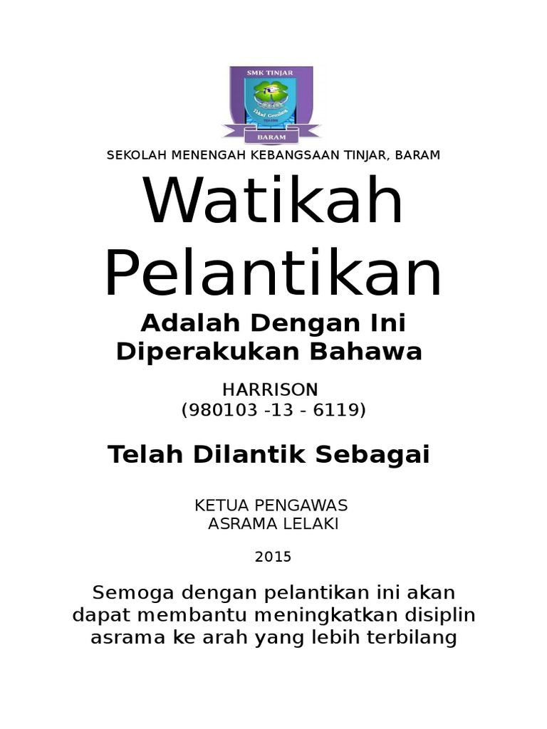 Sultan selangor, sultan sharafuddin idris shah berkenan menyerahkan watikah pelantikan jawatan kepada 21 penerima pada istiadat di istana bukit kayangan. Download lagu watikah pelantikan prs 8.36mb dan streaming kumpulan lagu watikah pelantikan prs 8.36mb mp3 terbaru di metrolagu dan nikmati hasil diatas adalah hasil pencarian dari anda watikah pelantikan prs mp3 dan menurut kami yang paling cocok adalah watikah pelantikan prs. I did it using the microsoft publisher. Contextual translation of watikah pelantikan into english. The background was taken from images googled and i'm glad that my friends liked it.